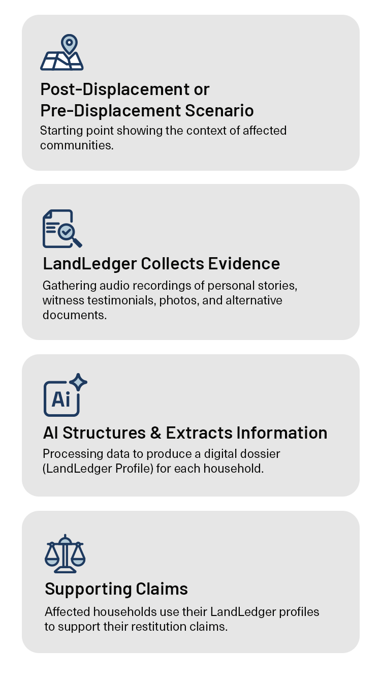 In post-conflict settings such as Syria, Sudan, and Ethiopia, where formal land registries have been destroyed, manipulated, or made inaccessible, LandLedger could allow displaced families to preserve proof of ownership and occupancy through stories, documents, and community testimonies. These digital records can later support restitution and return processes by offering prima-facie, time-stamped evidence of prior rights.